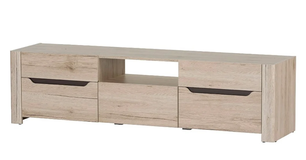 Moderní RTV stolek MAWSON Typ 1 se hodí do obývacího pokoje i jídelny a kombinuje přírodní dřevodekor s čistým, současným stylem. Díky bezúchytovému systému otevírání působí vzhledově elegantně a nenápadně.