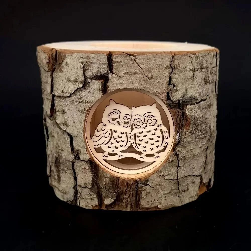 Tento unikátní svícen je vytvořen z olšového dřeva s jemným vkladem ze světlého topolu, zdobeným vyřezávanou sovou. Vnitřní prostor svícnu skrývá dřevěnou mističku určenou ke vložení čajové svíčky, což vytváří harmonické spojení přírody a praktického využití.