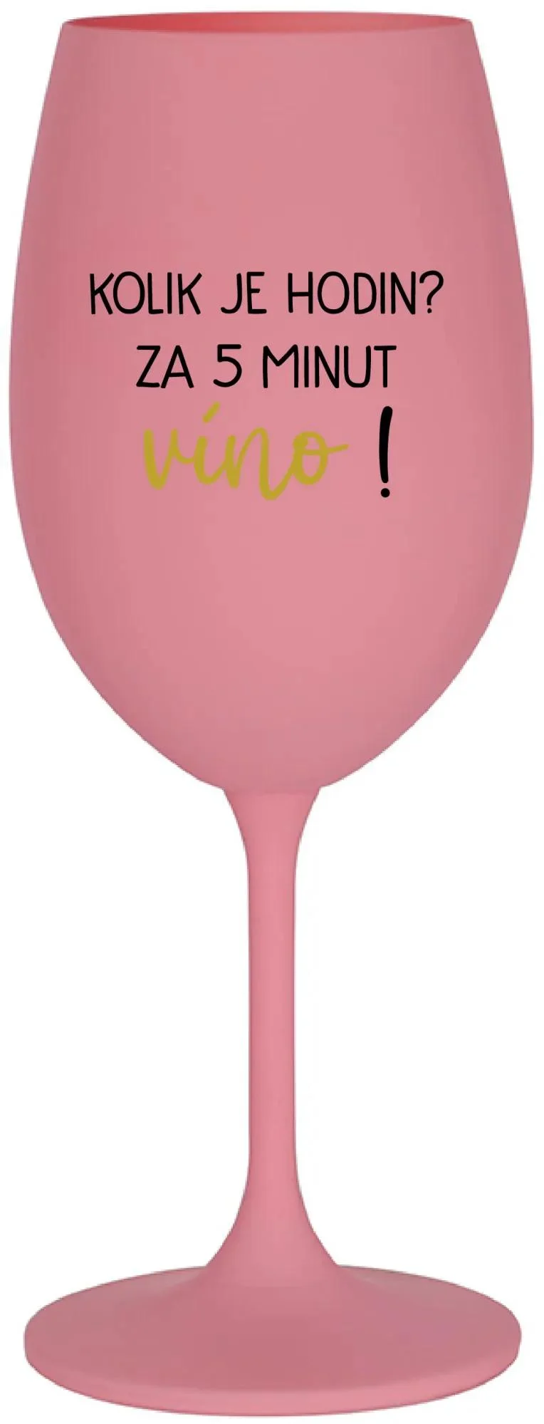 Stylová růžová sklenice na víno o objemu 350 ml s originálním motivem „Kolik je hodin? Za 5 minut víno!“ je ideálním dárkem i praktickým společníkem pro každodenní chvíle pohody. Vhodná na oslavy, večery s přáteli nebo relaxaci doma, tato vinná sklenice potěší každého milovníka vína, který si rád vychutnává život plnými doušky.
