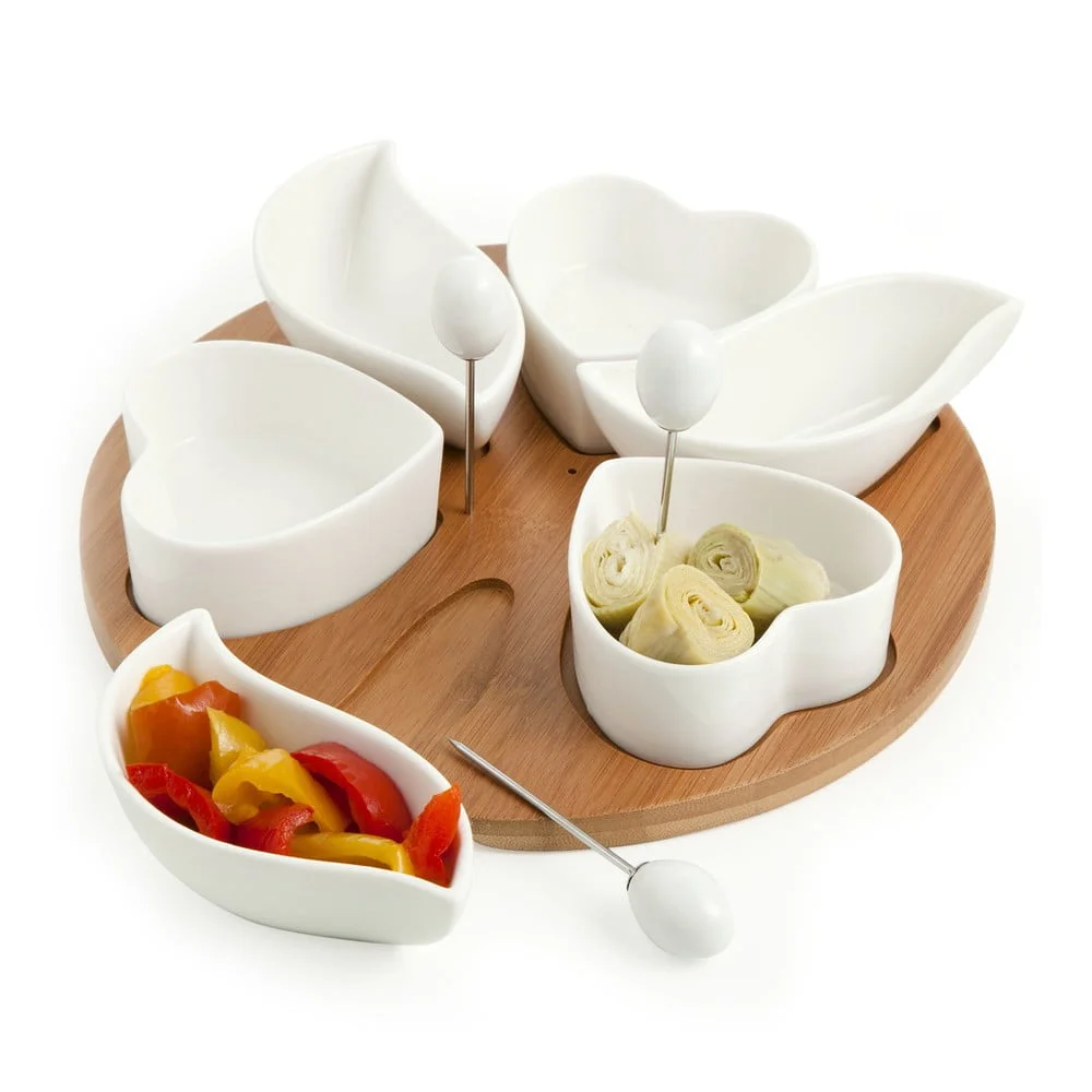 Objevte eleganci a styl při stolování s Brandani – italskou značkou, která spojuje vášeň pro design a funkčnost. Tato sada obsahuje šest originálních misek vyrobených z kvalitního porcelánu, každý doplněný o přírodní bambusový podnos a praktické napichovátko. Misky jsou ideální pro servírování různých pochoutek, a díky samostatnému podnosu je lze využít i jako samostatný podnos na další pokrmy nebo občerstvení.