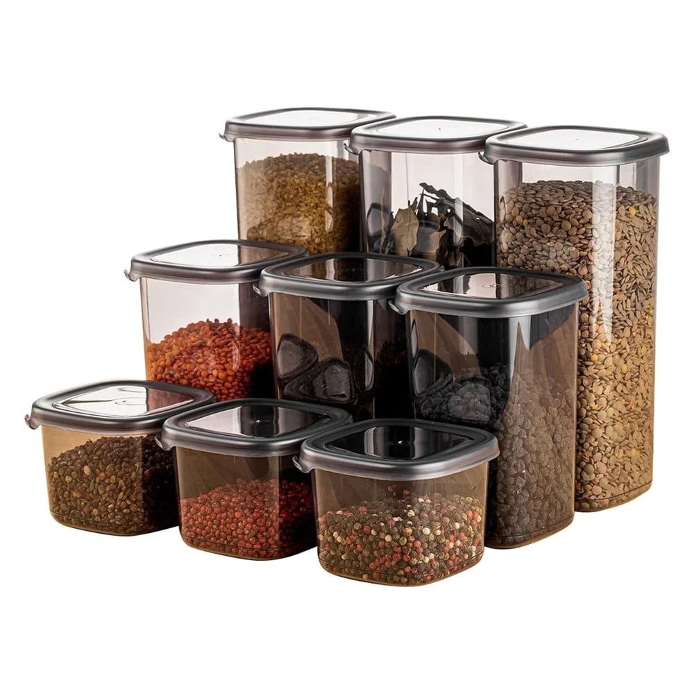 Elegantní sada obsahuje celkem devět praktických dóz různých velikostí, které jsou ideální pro skladování a uspořádání potravin v kuchyni. Součástí balení jsou tři menší krabičky s kapacitou 550 ml, střední s 1 200 ml a větší s 1 750 ml, všechny s rozměry 10 x 10 cm a výškou od 9,5 do 24,5 cm, což umožňuje efektivní využití prostoru.