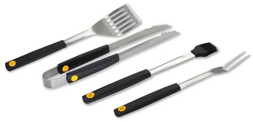 Tato sada obsahuje čtyři základní kuchyňské pomůcky pro grilování: lopatku, vidličku, kleště a štětku. Vyrobené s odolnými nerezovými částmi a pohodlnými plastovými rukojeťmi, které usnadní manipulaci.