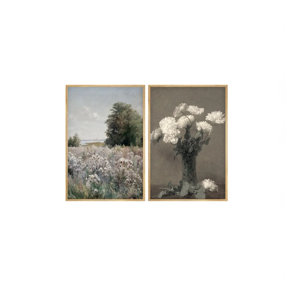 Proměňte svůj domov v klidnou oázu díky sadě dvou dekorativních obrazů s motivem zarostlé louky a květiny ve váze, které jsou zpracovány na MDF a zasazeny do masivního rámu. Každý kus má 3 mm tlustý MDF podklad a rám ze dřeva o šířce 2 cm, což zajišťuje pevnost a dlouhou životnost.