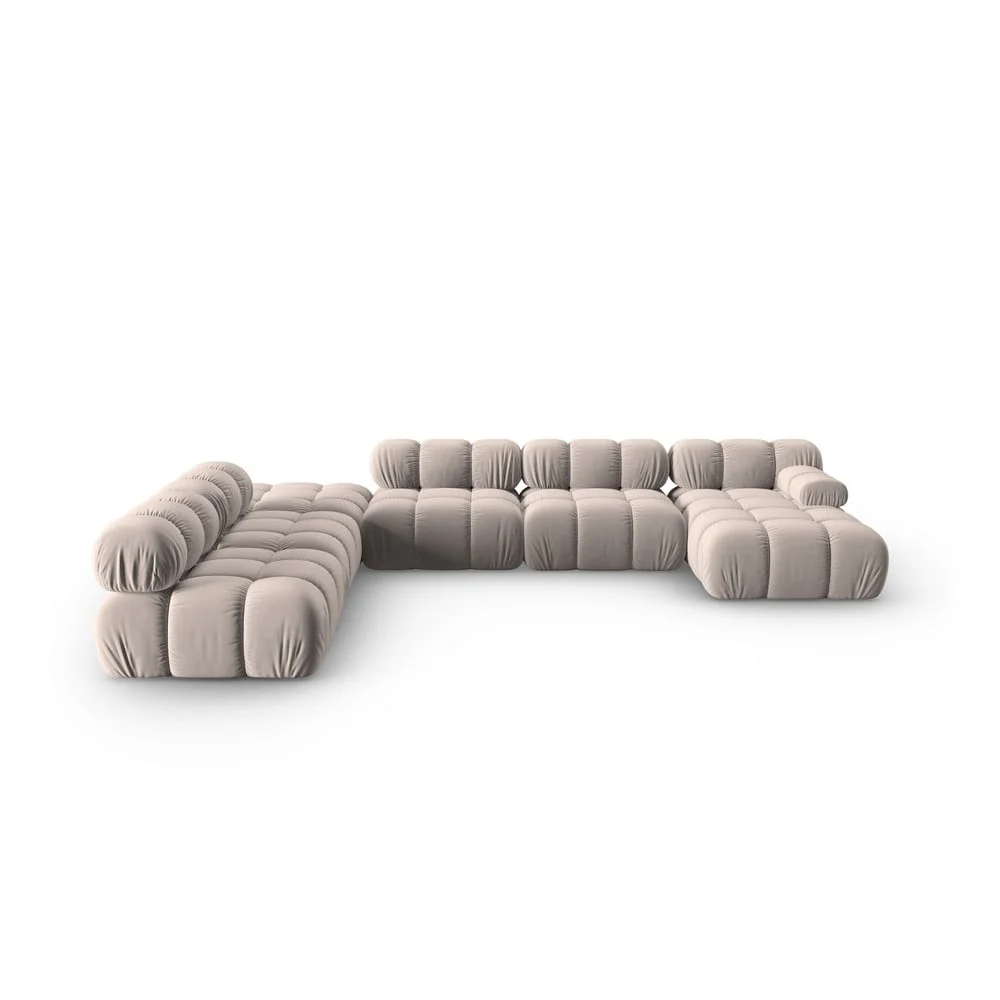 Objevte komfort a eleganci s světle hnědou sametovou rohovou pohovkou Bellis. Tento modulární kus nábytku je navržen tak, aby se snadno přizpůsobil vašemu prostoru, ať už preferujete levý roh nebo uspořádání do "U".