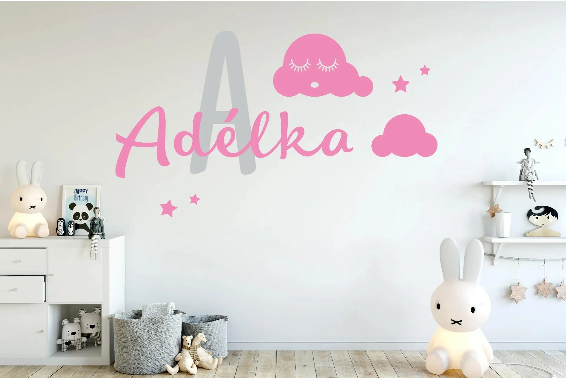 Originální dětská samolepka s motivem mraků a osobním jménem, vhodná pro děvčata, v elegantní kombinaci pastelové růžové a světle šedé. Tento dekorativní prvek je vyroben z vysoce kvalitní, zdravotně nezávadné fólie s matným povrchem, která zaručuje dlouhou životnost až 5 let a skvělý vzhled ze všech úhlů.