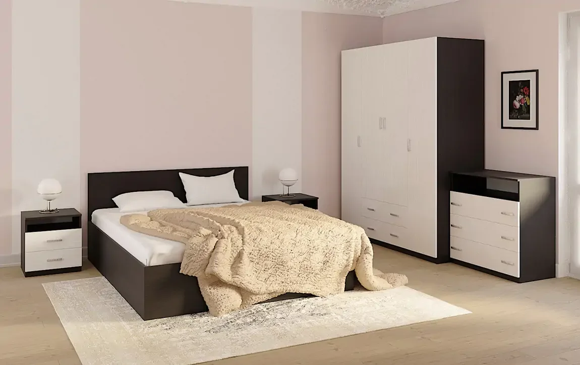 Santos Sestava do ložnice v provedení wenge/bílá kombinuje elegantní kontrast tmavého dřeva s čistě bílými plochami a je vyrobena z kvalitní LTD desky o tloušťce 16 mm. Sestava obsahuje komodu 80 x 84 x 46 cm, dva noční stolky 45 x 49,5 x 43 cm, šatní skříň 160 x 205 x 57 cm a postel pro matraci 160 x 200 cm (rám postele 170 x 95 x 205,2 cm). Rám roštu a matrace nejsou součástí balení a je třeba je objednat zvlášť podle vašich představ; doporučená varianta matrace je 160 x 200 cm, případně dvě matrace 80 x 200 cm. Sestavu dodáváme v demontovaném stavu. Díky pevnému provedení a promyšlenému uspořádání nabízí dostatek úložného prostoru a působí moderním dojmem v každé ložnici. V budoucnu ji lze snadno doplnit o další prvky nebo rozšířit podle změn vkusu a prostoru.