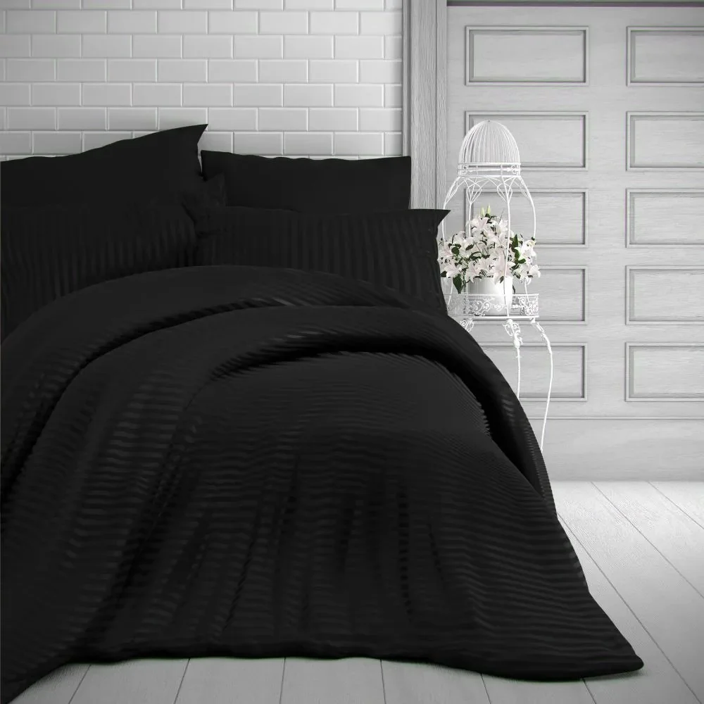 Stylové a luxusní saténové povlečení s tenkými vodorovnými proužky v elegantní černé barvě představuje ideální volbu pro moderní ložnici. Vyrobeno z jemné bavlněné tkaniny atlasové vazby, která zajišťuje nejen působivý lesk, ale i pevnost a příjemný omak.