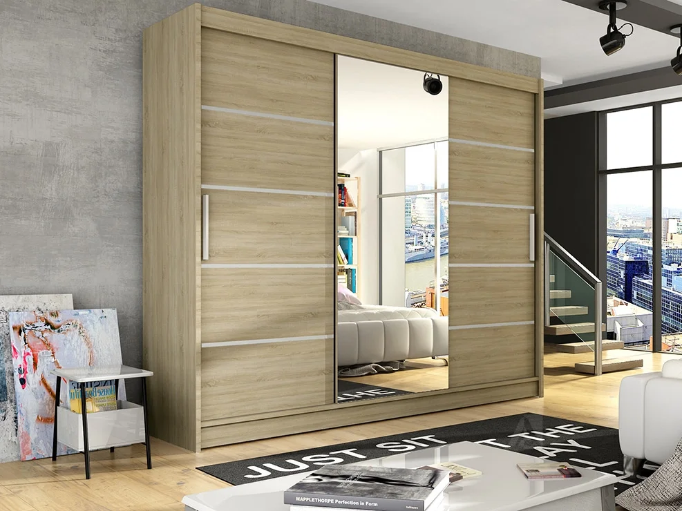 Šatní skříň ANDE VI v dekoru dub sonoma s posuvnými dveřmi a zabudovaným zrcadlem nabízí praktické řešení pro uspořádání šatů. Rozměry 250 × 58 × 215 cm (š x h x v) zajišťují dostatek prostoru i do menších ložnic.