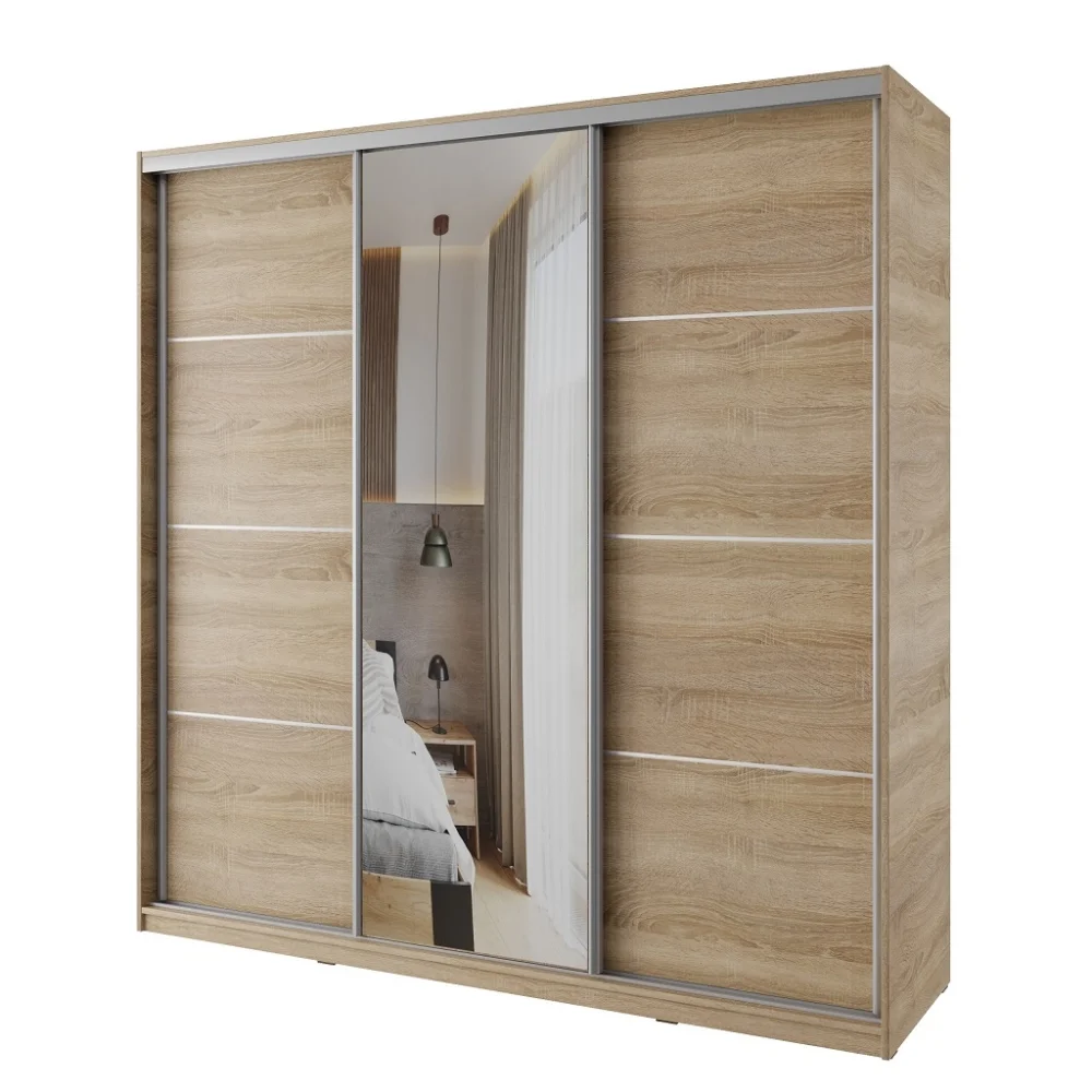 Třídvéřová šatní skříň s posuvnými dveřmi a zabudovaným zrcadlem v odstínu dub sonoma působí elegantně a moderně. Rozměry (š x v x h): 200 × 205 × 56,3 cm zajišťují dostatek místa pro šaty, doplňky i každodenní úklid bižuterie. Skříň je vyrobená z lamina s melaminovou ochranou hrany a uvnitř najdete 4 šuplíky na rolničkových výsuvech, police a 2 šatní tyče pro efektivní organizaci oděvů. Dveře lze doplnit ozdobnými lištami, nebo je ponechat bez nich pro hladký, čistý vzhled – volba je na vás. Dodáváno v demontu, montáž je jednoduchá a zvládne ji téměř každý.