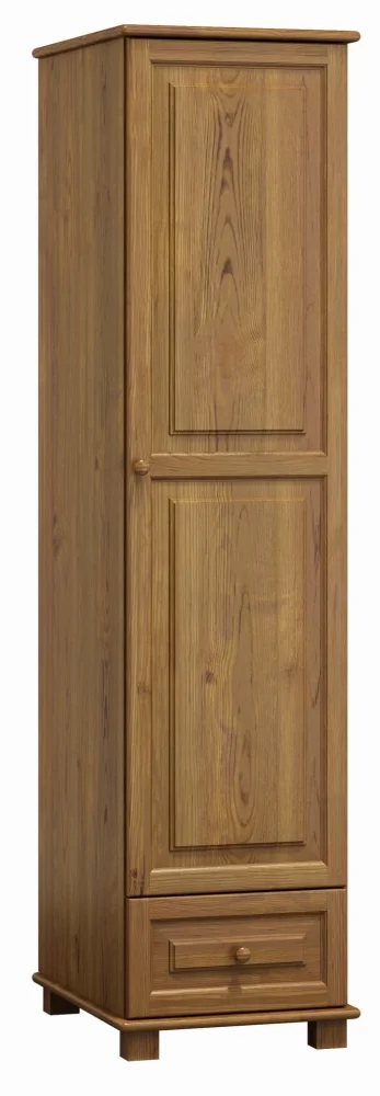 Šatní skříň s integrovanou šatní tyčí a praktickou zásuvkou je uzpůsobená pro pohodlné uložení oblečení. Je vyrobena z borovicového masivu o tloušťce 2,6 cm a povrch má dubový odstín, který dodává nábytku teplý a příjemný vzhled. Rozměry skříně činí 190 cm na výšku, 47 cm na šířku a 60 cm na hloubku. Dodáváno v demontu pro snadnou přepravu a rychlou montáž doma.