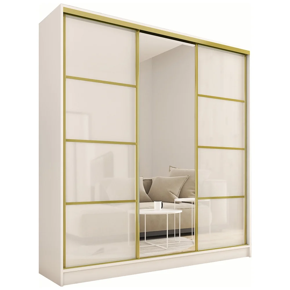 Skříň DAZIO 180 je vybavena posuvnými dvířky a zabudovaným zrcadlem, které šetří prostor v místnosti. Rozměry dosahují 180 cm na šířku, 205 cm na výšku a 56 cm hloubky; povrch je z lamina tloušťky 16 mm a v barevném provedení bílý lesk. Vnitřek nabízí šest polic, dvě šatní tyče a čtyři zásuvky, což umožňuje perfektní organizaci oděvů a doplňků. Ozdobné lišty a kovové kování jsou zlaté, což dodává skříni elegantní vzhled; lišty na dveřích nejsou povinné – dveře mohou být i bez nich. Dodáváno v demontu, usnadňuje snadnou montáž a přepravu; díky inteligentnímu uspořádání vnitřního prostoru budete mít vždy vše po ruce, a zrcadlo navíc vizuálně zvětší prostor a ušetří čas při výběru outfitu.