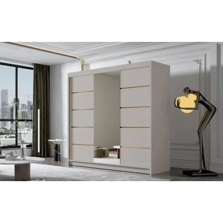 Rozměry 200 × 215 × 58 cm zajišťují dostatek místa a kompaktnost do menších i prostornějších pokojů. Vyrobena z 16mm laminované desky, která nabízí odolnost i snadnou údržbu. Posuvné dveře šetří místo a dotvářejí elegantní vzhled, zatímco zlaté hliníkové lišty a ozdobné prvky dodávají šmrnc. Součástí je velké zrcadlo, které opticky zvětšuje prostor a usnadňuje každodenní úpravy. Osvědčená kombinace tichého chodu dveří a jednoduché montáže zajišťuje pohodlí při sestavování. Dodáváno v demontu; montáž je jednoduchá podle přiloženého návodu. Ilustrativní zobrazení vnitřního členění může mít jinou barvu vnitřního prostoru. Luxusní detaily a kvalitní provedení z ní dělají skvělou volbu pro moderní ložnice.