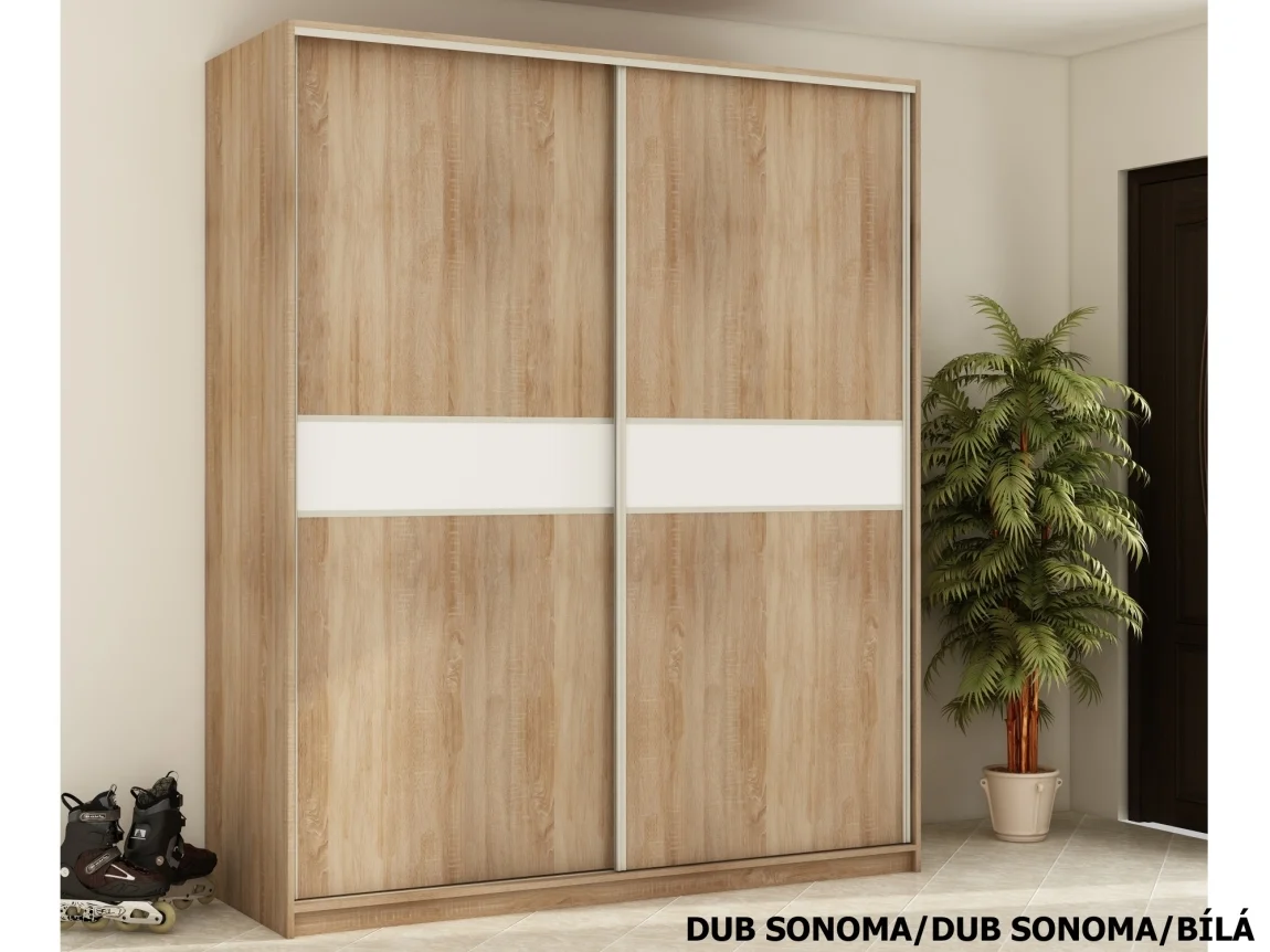 Praktická šatní skříň s promyšleným vnitřním rozdělením, které uvidíte na doprovodném obrázku. Rozměry: 160 × 216 × 65 cm (š x v x h). LTD 16 mm deska zaručuje pevnost a dlouhou životnost celé konstrukce. Dekor kombinuje korpus a dveře v dubu sonoma s čistým bílým pruhem na dveřích, díky čemuž působí svěže a moderně. Skříň se dodává v demontovaném stavu, instalace je rychlá a snadná. Využijete ji skvěle jak v ložnici, tak v šatně díky neutrálnímu vzhledu. Užitečné vnitřní členění usnadní organizaci oděvů. Záruka 5 let.