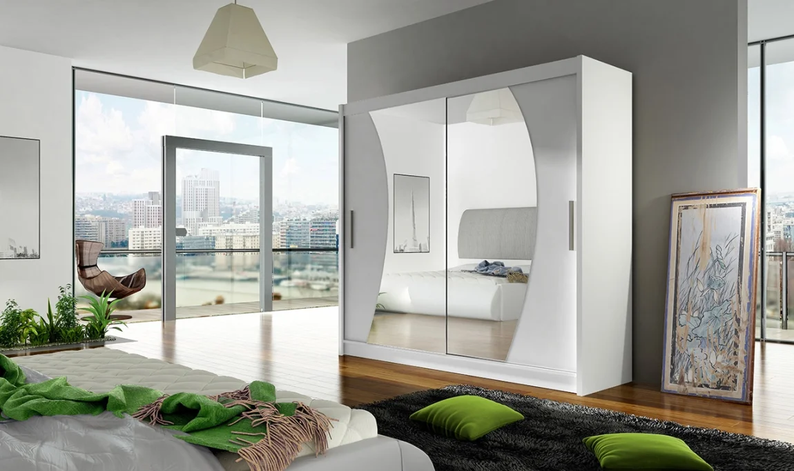 Šatní skříň GAMBA IX kombinuje elegantní bílý mat se zabudovaným zrcadlem a nabízí praktický úložný prostor. Rozměry 180 × 57 × 215 cm zajišťují dostatek místa pro oblečení a doplňky.