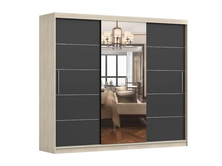 GOFREDO šatní skříň s posuvnými dveřmi a vestavěným zrcadlem je praktickým a stylovým řešením pro moderní ložnici. Je k dispozici v provedení dub sonoma/černá a měří 250 cm na šířku, 218 cm na výšku a 61 cm do hloubky, což poskytuje dostatek úložného prostoru.