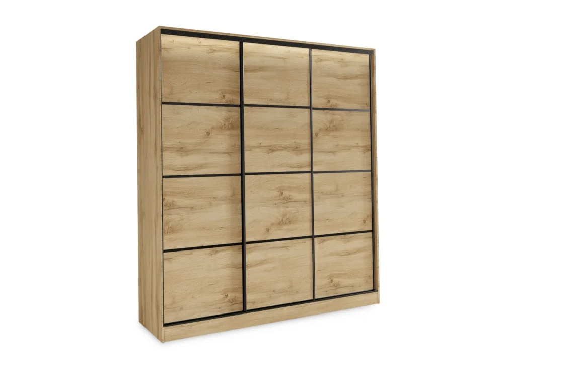 Šatní skříň HARAZIA 150 představuje praktické řešení s čistým vzhledem a promyšleným vnitřním uspořádáním. Disponuje posuvnými dveřmi, z nichž lišty na dveřích nejsou nutné, pro hladký a minimalistický vzhled. Rozměry skříně: šířka 150 cm, výška 205 cm a hloubka 56 cm. Je vyrobena z lamina v dekoru dub wotan a díky tomu je údržba snadná a odolná. Uvnitř najdete 6 polic, 2 šatní tyče a 4 šuplíky, které vám umožní efektivně roztřídit oblečení i doplňky. Dodáváno v demontu.