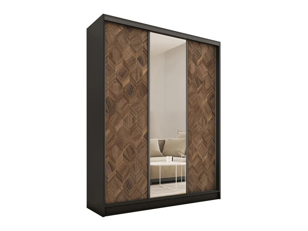 Kombinovaná šatní skříň HARAZIA 150 kombinuje vestavěné zrcadlo s praktickými posuvnými dveřmi a nabízí přehledné vnitřní členění pro oblečení. Rozměry 150 cm na šířku, 205 cm na výšku a 56 cm na hloubku zajistí dostatek prostoru pro uspořádání oděvů. Je vyrobena z lamina o tloušťce 16 mm v provedení černý mat s ořechovým dekorem v art déco stylu. Uvnitř najdete 6 polic, 2 šatní tyče a 4 šuplíky, což umožňuje efektivní třídění podle typu i délky. Skříň je dodávána v demontu, ale montáž je jednoduchá a rychlá. Díky zrcadlu a elegantnímu vzhledu se hodí do moderní ložnice a zároveň šetří místo díky prostoru, který kombinuje do jednoho řešení.