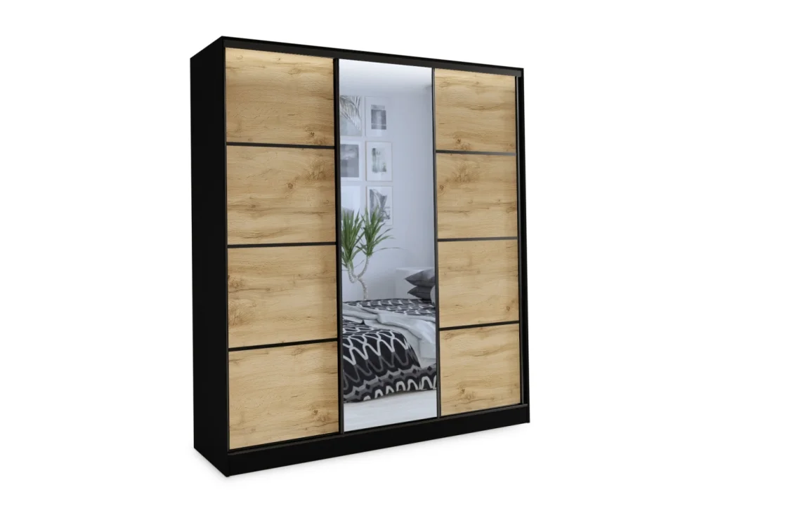 Šatní skříň HARAZIA 150 se zrcadlem, černý mat/dub wotan Skříně a skřínky