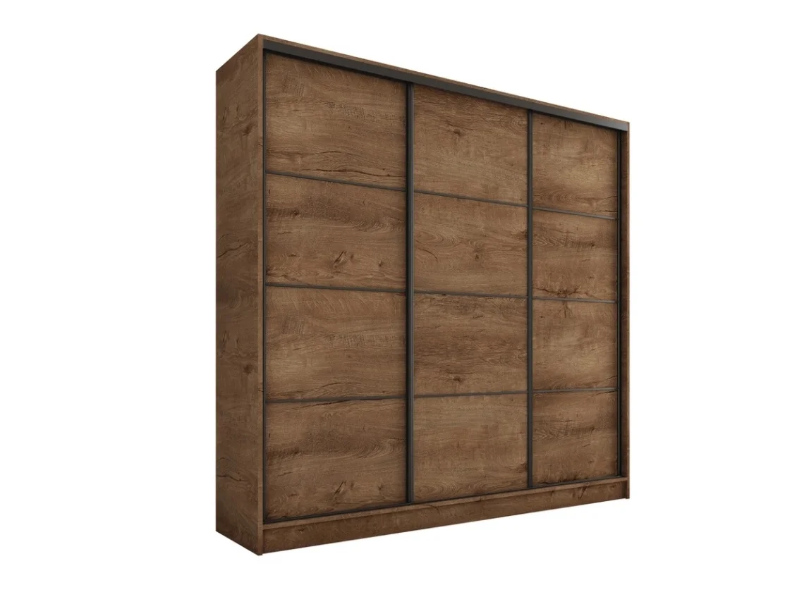 Praktická šatní skříň s posuvnými dveřmi v dekoru dub Lefkas kombinuje moderní vzhled s pohodlným úložným prostorem. Dveře lze doplnit ozdobnými lištami, které však není nutné instalovat; můžete mít hladké dveře bez lišt. Rozměry skříně jsou 180 × 205 × 56 cm a materiál je lamino v barevném provedení dub Lefkas. Vnitřek nabízí 6 polic, 2 šatní tyče a 4 šuplíky pro přehledné uložení oblečení a doplňků. Dodáváme v demontu, což usnadňuje přepravu i montáž doma. Díky neutrálnímu dekoru se skříň hodí do moderních i tradičních interiérů.