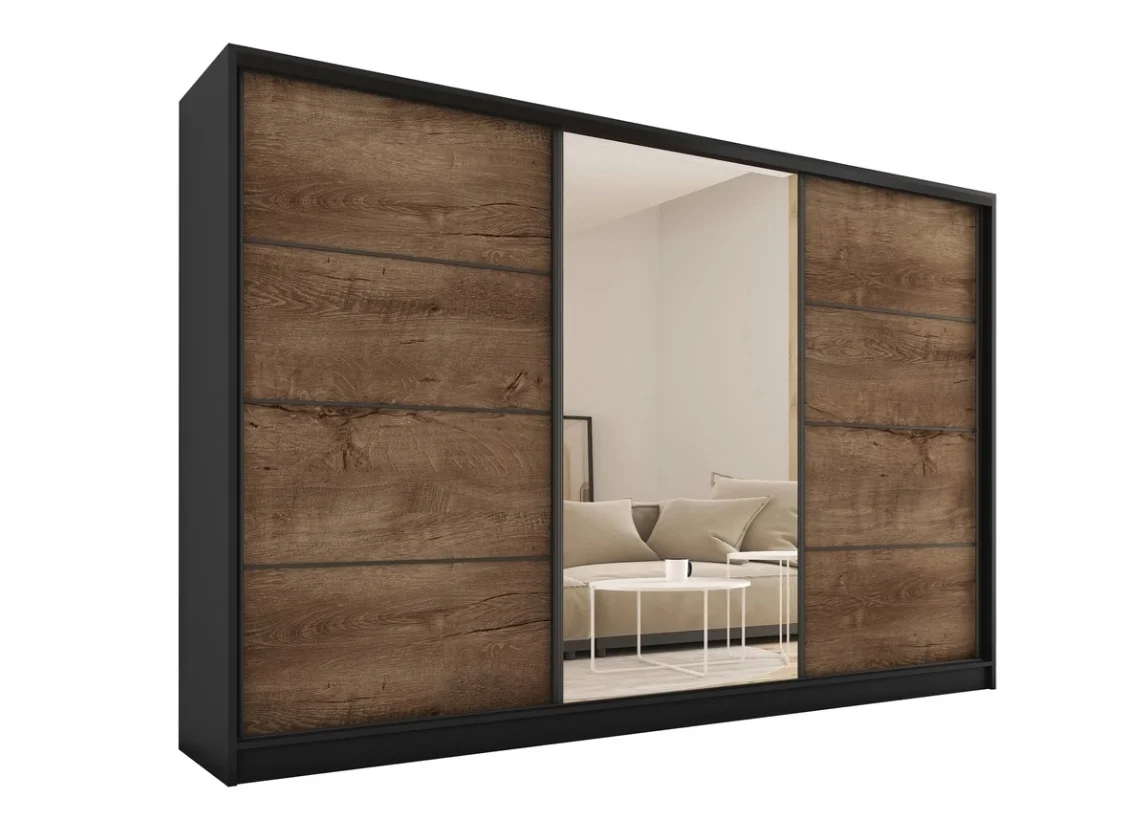 Rozměry 280 x 205 x 56 cm a povrch z lamina v kombinaci černého matu s dubem Lefkas zaručují snadnou údržbu a nadčasový vzhled. Vnitřní prostor zahrnuje 6 polic, 2 šatní tyče a 4 šuplíky, takže úložný prostor je dobře organizovaný pro oblečení i doplňky. S moderním designem a díky posuvným dveřím šetříte místo. Dodáváno v demontu, montáž zvládnete sami doma.