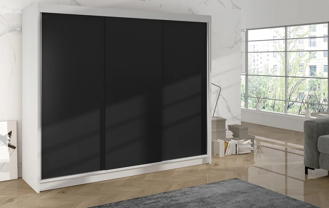 Šatní skříň HARDY II v kombinaci bílé a černé barvy přináší moderní vzhled do každé ložnice. Její rozměry 200 cm šířky, 58 cm hloubky a 215 cm výšky nabízejí dostatek místa pro šaty, košile i doplňky.