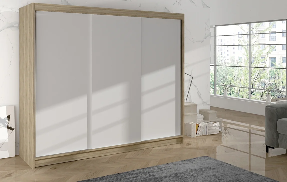 Šatní skříň HARDY II v kombinaci dub sonoma a bílé nabídne moderní vzhled a dostatek úložného prostoru. Rozměry 200 × 58 × 215 cm poskytují komfortní kapacitu pro vaše šaty, košile i doplňky, zatímco konstrukce z 16 mm laminované desky s ABS hranami zaručuje pevnost a odolnost. Dveře běží na hliníkových kolejnicích Sevroll pro tichý a lehký chod a úchyty ve tvaru hliníkové lišty minimalizují riziko deformací. Dodáváno v demontu, montáž je snadná a rychlá díky jasné konstrukci a přesnému dozoru dílů. Díky světlému kontrastu dubu sonoma a bílé působí skříň vzdušně a snadno se sladí s různými interiéry, což ji činí vhodnou volbou pro moderní ložnice.