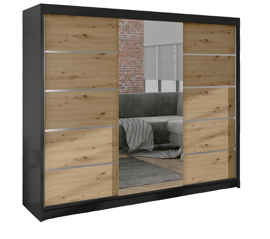 Šatní skříň HARDY VI s vestavěným zrcadlem kombinuje praktické úložiště s moderním designem. Barva provedení černá s dekorem dub artisan dodává skříni nadčasový vzhled. Rozměry: 200 cm šířka, 58 cm hloubka a 215 cm výška zajistí dostatek místa pro vaše oblečení.