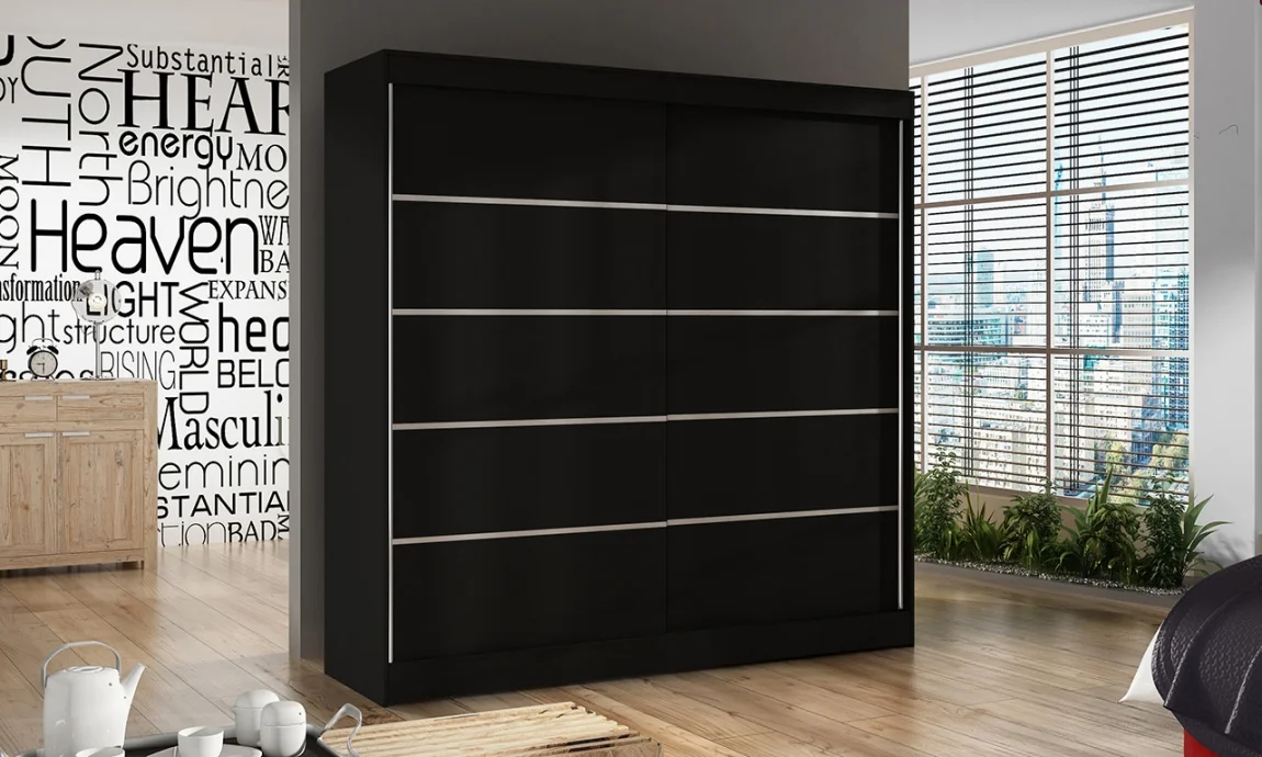 Šatní skříň HEMIS IV v elegantní černé barvě nabídne dostatek místa pro vaše oblečení. Rozměry 200 × 58 × 215 cm zajišťují pohodlné uložení i pro širší sortiment kousků. Vyrobena je z 16 mm laminované desky s ABS hranami, které zajišťují odolnost a dlouhou životnost. Pro hladký chod dveří slouží hliníkové kolejnice Sevroll a úchyty z hliníkové lišty, které zabraňují jejich ohýbání. Obrázek vnitřního uspořádání je ilustrační; skutečné uspořádání interiéru a barva mohou mírně odlišovat. Dodáváno v demontu.