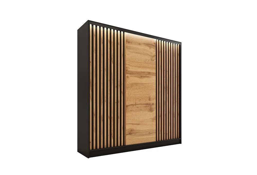 Stylová šatní skříň INSULAR 150 3D bez zrcadla přináší moderní vzhled a praktický úložný prostor. Rozměry (š x v x h) 150 × 205 × 56 cm a materiál lamino zajišťují snadnou údržbu a dlouhou životnost, v provedení černý mat/dub wotan.