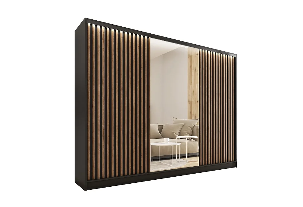 Šatní skříň INSULAR 250 – posuvné dveře, zrcadlo, černý mat/dub lefkas Skříně a skřínky