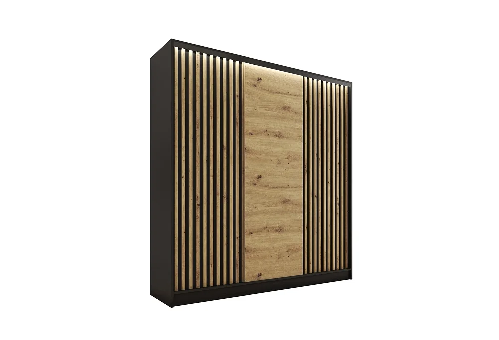 Šatní skříň s posuvnými dveřmi kombinuje moderní vzhled s praktickým vnitřním uspořádáním. Rozměry (š x v x h): 150 x 205 x 56 cm. Vyrobena z laminovaného materiálu v kombinaci černého matu a dub artisan, která působí nadčasově a snadno se čistí. Vnitřní prostor nabízí 6 polic, 2 šatní tyče a 4 šuplíky, takže všechno oblečení a doplňky budete mít skvěle pohromadě. Dodáváno v demontu pro pohodlnou dopravu a rychlou montáž.