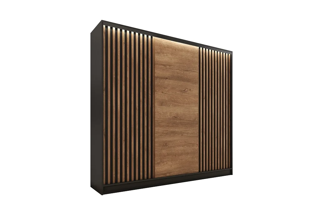Šatní skříň INSULAR 3D 200 v moderním provedení se vyznačuje kontrastem černého matu a dřevodekoru dub lefkas. Rozměry (š x v x h): 200 x 205 x 56 cm. Materiál je lamino, který zajišťuje snadnou údržbu a jednotný vzhled. Vnitřní prostor je rozdělen na 6 polic, 2 šatní tyče a 4 šuplíky, takže se postará o pohodlné a přehledné uspořádání oděvů a doplňků. Díky posuvným dveřím šetří plochu místnosti a dodává skříni elegantní vzhled. Dodáváno v demontu.