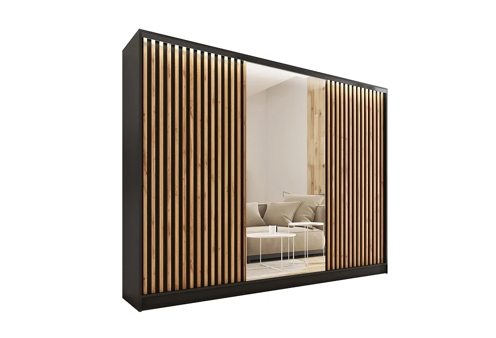 Šatní skříň INSULAR 3D 250 s posuvnými dveřmi a zrcadlem, černý mat/dub Wotan Skříně a skřínky