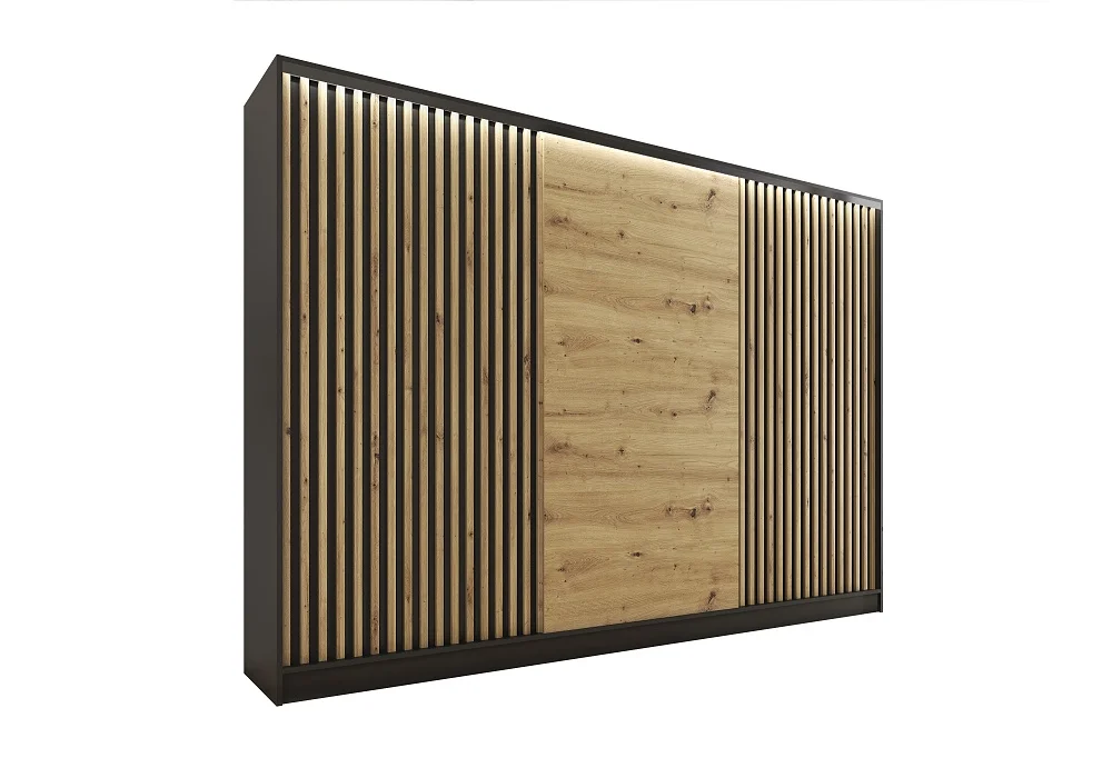Šatní skříň s posuvnými dveřmi nabízí praktické řešení pro úložný prostor. Její rozměry jsou 280 × 205 × 56 cm. Vyrobena z lamino v kombinaci černého matu a dub artisan, která dodává moderní vzhled.
