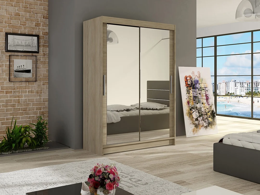 Šatní skříň s integrovaným zrcadlem v dezénu sonoma nabízí praktické a elegantní řešení pro skladování oblečení. Rozměry jsou 120 × 58 × 200 cm (š × v × h). 16 mm laminovaná deska s ABS hranami zaručuje pevnost a snadnou údržbu.