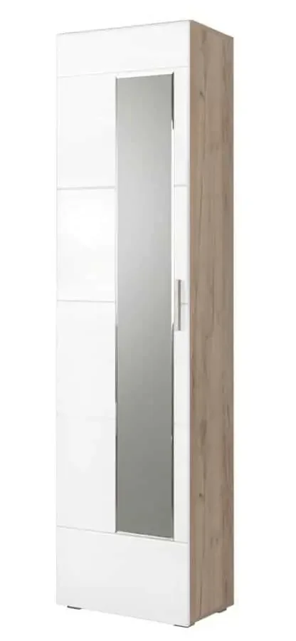 Šatní jednodveřová skříň s integrovaným zrcadlem je vyrobena z LTD desky v odstínu dub kraft šedý (korpus) a dveře jsou MDF v bílém lesku. Uvnitř najdete horní a spodní police a uprostřed praktickou šatní tyč, která uspořádá váš oděv do přehledných vrstev. Skříň skvěle doplní předsíňovou stěnu LAIN, ale lze ji používat i samostatně. Díky zrcadlu můžete kdykoli rychle zkontrolovat vzhled před odchodem z domu. Dodáváme v demontovaném stavu; pro lepší organizaci doporučujeme podívat se i na naše botníky, abyste vše měli na jednom místě. Tato kombinace odolných materiálů a jednoduchého designu zajistí snadnou údržbu a dlouhou životnost, zatímco kompaktní rozměry ji činí ideální volbou pro menší prostory.