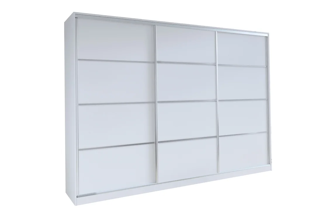 Tato šatní skříň s posuvnými dveřmi kombinuje moderní vzhled s praktickým vnitřním uspořádáním pro efektivní ukládání oděvů. Dveře lze ponechat bez ozdobných lišt, což vytváří hladké a čisté linie bez zbytečných detailů. Rozměry (š x v x h): 250 x 205 x 56 cm. Povrch lamino je v bílé matné úpravě, odolný proti nárazům a snadný na údržbu. Uvnitř najdete 6 polic, 2 šatní tyče a 4 šuplíky, které umožní dobře roztřídit oblečení, doplňky i sezónní věci. Dodáváno v demontu pro pohodlnou přepravu a montáž doma.