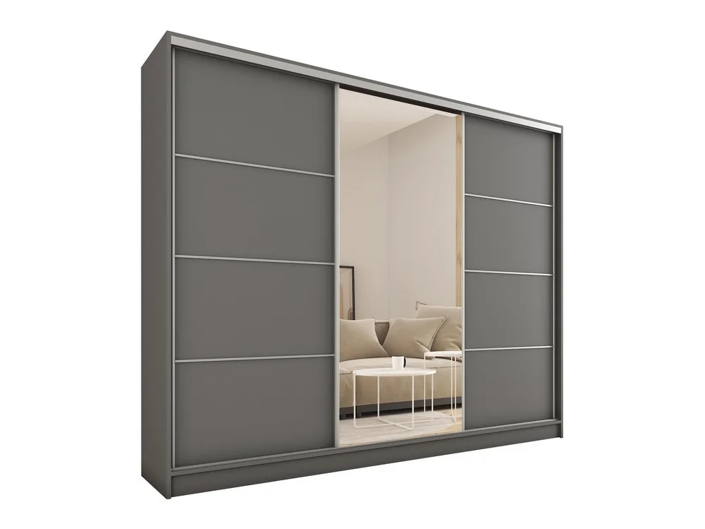 Elegantní šatní skříň s posuvnými dveřmi a zabudovaným zrcadlem dodá moderní vzhled každé ložnici. Dveře mohou být bez ozdobných lišt, čímž vznikne čistý a hladký vzhled. Rozměry: 250 × 205 × 56 cm.