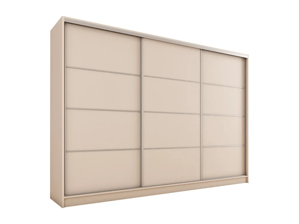 Šatní skříň LITOLARIS 280 bez zrcadla s posuvnými dveřmi nabízí čistý, moderní vzhled a lze volitelně vynechat ozdobné lišty pro hladké dveře. Rozměry skříně činí 280 x 205 x 56 cm a povrch je vyroben z lamina tloušťky 16 mm v pískově béžové barvě.