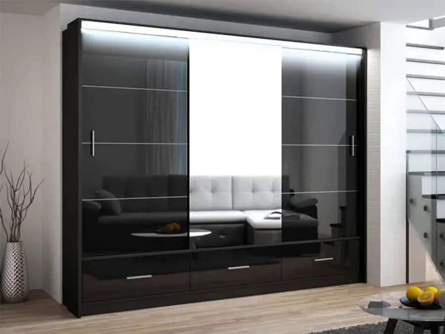 Černá šatní skříň s posuvnými dveřmi, LED osvětlením a zrcadlem dodá moderní interiérový vzhled. Využijete ji pro přehledné uložení oblečení, ložního prádla a dalších věcí díky třem zásuvkám, policím a šatním tyčím. Korpus i dveře jsou vyrobeny z laminované DTD v černé barvě; prostřední dveře zdobí zrcadlo, boční strany jsou lesklé černé. Kvalitní kování Sevroll a plastové úchyty zajišťují snadnou manipulaci a dlouhou životnost. Elegantní LED osvětlení je součástí balení a vytváří příjemnou atmosféru při večerním používání. Skříň je dodávána v demontovaném stavu, ale montáž je rychlá a jednoduchá i pro méně zkušené uživatele.