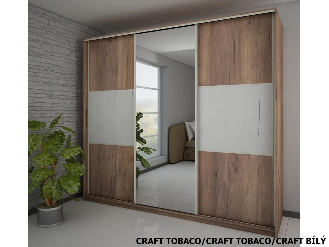 Šatní skříň MELROSE 5D se zrcadlem nabízí praktické vnitřní rozdělení, které usnadní organizaci oděvů a doplňků podle potřeby. Rozměry (š x v x h): 240 × 216 × 65 cm. Vyrobena z LTD desky o tloušťce 16 mm a sladěná barevná kombinace korpusu a dveří craft tobaco s pruhem craft bílé dodá interiéru moderní vzhled.