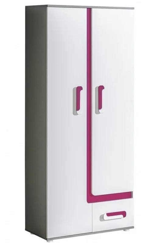 Patří do sektorové řady ORAKI I a vyznačuje se netradičním sladěním barev a originálními úchyty. Korpus v antracitové barvě doplňují bílé matné dveře a výrazný růžový akcent. Úchytky v kombinaci růžové a bílé podtrhují moderní vzhled a usnadňují manipulaci.