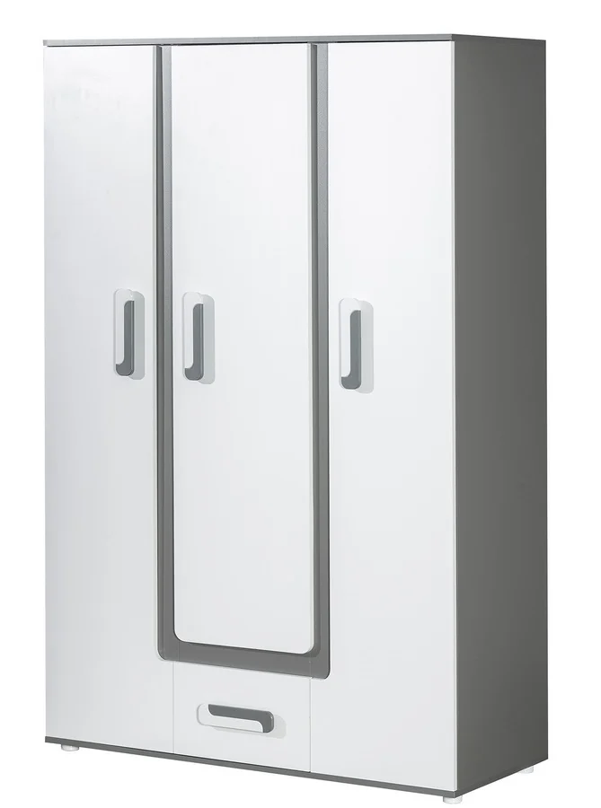 Elegantní třídveřová šatní skříň v kombinaci antracitového korpusu a matných bílých dveří patří do naší sektorové řady. Tento modulární sektorový nábytek přináší netradiční barevné zpracování a originální úchyty, které zaujmou mladší generaci.