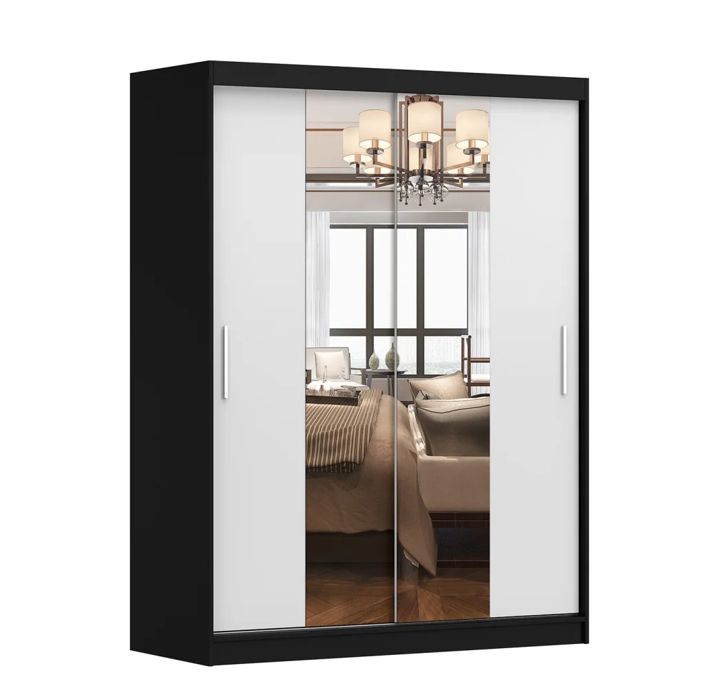 Šatní skříň s posuvnými dveřmi a zabudovaným zrcadlem v provedení černá/bílá přináší praktický a moderní způsob uskladnění. Rozměry 150 × 200 × 61 cm (š × v × h) nabízejí dostatek prostoru pro vaše oděvy a doplňky. Povrch je tvořen laminem o tloušťce 16 mm s ABS hranami, které zaručují vyšší odolnost proti poškrábání a dlouhou životnost. Úchyty jsou vyrobeny z PVC a lišty z kovu zajišťují pevnou a lehkou manipulaci s dveřmi. Dodáváno v demontu, součástí bývá návod pro rychlou montáž. Integrované zrcadlo navíc opticky zvětšuje prostor a usnadňuje denní rutiny.