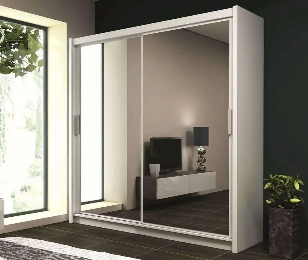 Moderní bílá šatní skříň s posuvnými dveřmi a zabudovanými zrcadly je ideálním řešením pro každý interiér. Díky svému světlému provedení a zrcadlům vizuálně zvětší a prosvětlí jakýkoli prostor, ať už se jedná o ložnici, předsíň nebo obývací pokoj. Vnitřní uspořádání nabízí dostatek místa na zavěšení oblečení i uspořádání věcí na policích, což vám umožní udržet pořádek snadno a efektivně. Vyrobena je z odolné laminované dřevotřísky, která zaručuje dlouhou životnost. Skříň je dodávána v demontovaném stavu, což usnadňuje její přepravu a montáž, a její jednoduchý design se hodí do mnoha moderních interiérů. Díky praktickým plastovým úchytům je manipulace s dveřmi velmi komfortní. Tento kousek je skvělou volbou pro všechny, kdo hledají funkční a estetický úložný prostor.