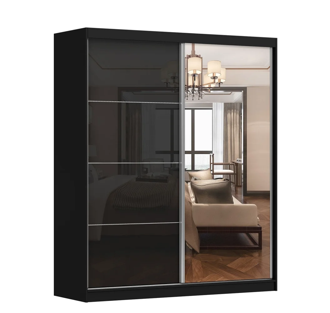 Stylová šatní skříň s posuvnými dveřmi a vestavěným zrcadlem v provedení černý lesk přináší praktické a elegantní řešení pro váš prostor. Rozměry 183 cm na šířku, 218 cm na výšku a 61 cm do hloubky umožňují pohodlné ukládání oblečení i doplňků.