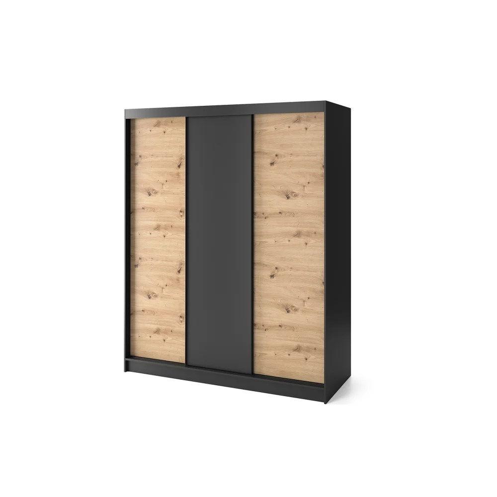 Elegantní šatní skříň RISOLUTO III s posuvnými dveřmi nabízí efektivní využití prostoru a moderní vzhled do každé ložnice. Vnitřek skříně zahrnuje jednu šatní tyč a šest praktických polic, které pojmou všechno oblečení i doplňky. Barva kombinující dub artisan a matně černé detaily dodá nábytku nadčasový šarm. Rozměry 180 × 220 × 60 cm zajišťují dostatek úložného prostoru, zatímco materiál MDF s ABS hranami garantuje pevnost a dlouhou životnost. Dodání probíhá v demontu.