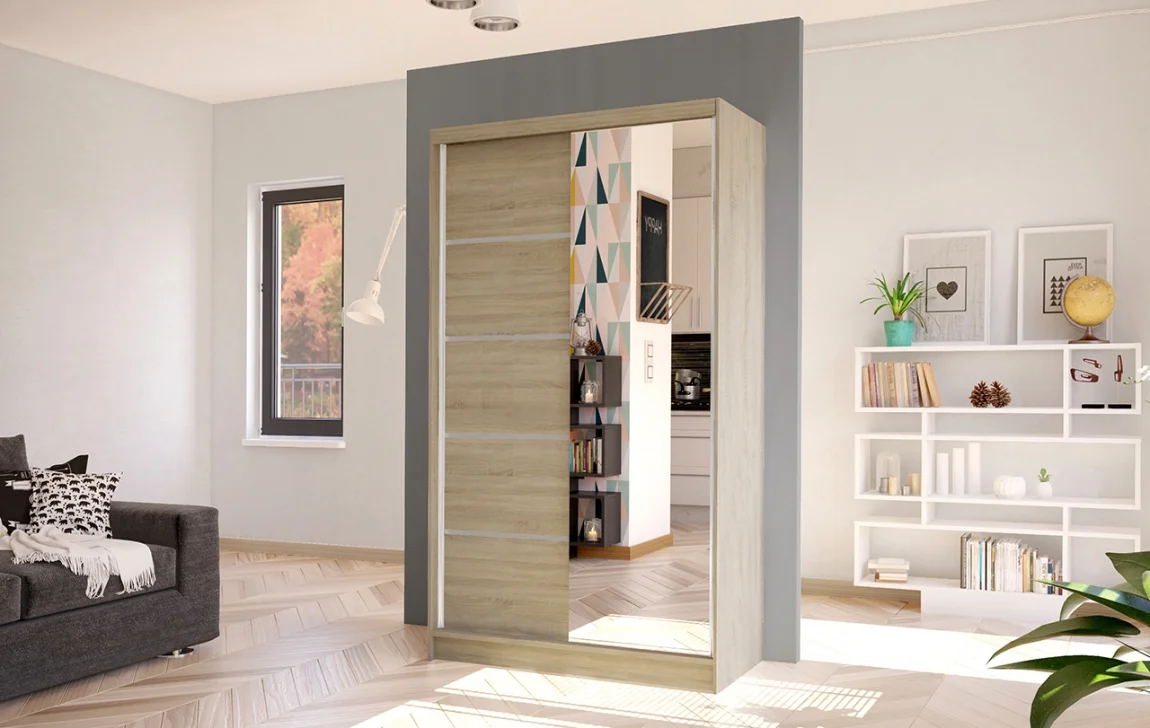 Šatní skříň s vestavěným zrcadlem a posuvnými dveřmi v dekoru dub sonoma představuje praktické a stylové řešení pro ložnici. Rozměry: šířka 100 cm, výška 200 cm, hloubka 58 cm. Konstrukce je vyrobena z laminované desky o tloušťce 16 mm s ABS hranami, což zajišťuje vyšší odolnost proti poškrábání a nárazům. K tomuto systému patří hliníkové kolejnice Sevroll pro plynulý a tichý chod dveří a úchyty ve formě hliníkové lišty, které zpevní a zabrání ohýbání dveří. Vizuální efekt zrcadla navíc opticky zvětší prostor a usnadní denní rutinu. Dodáváno v demontu.
