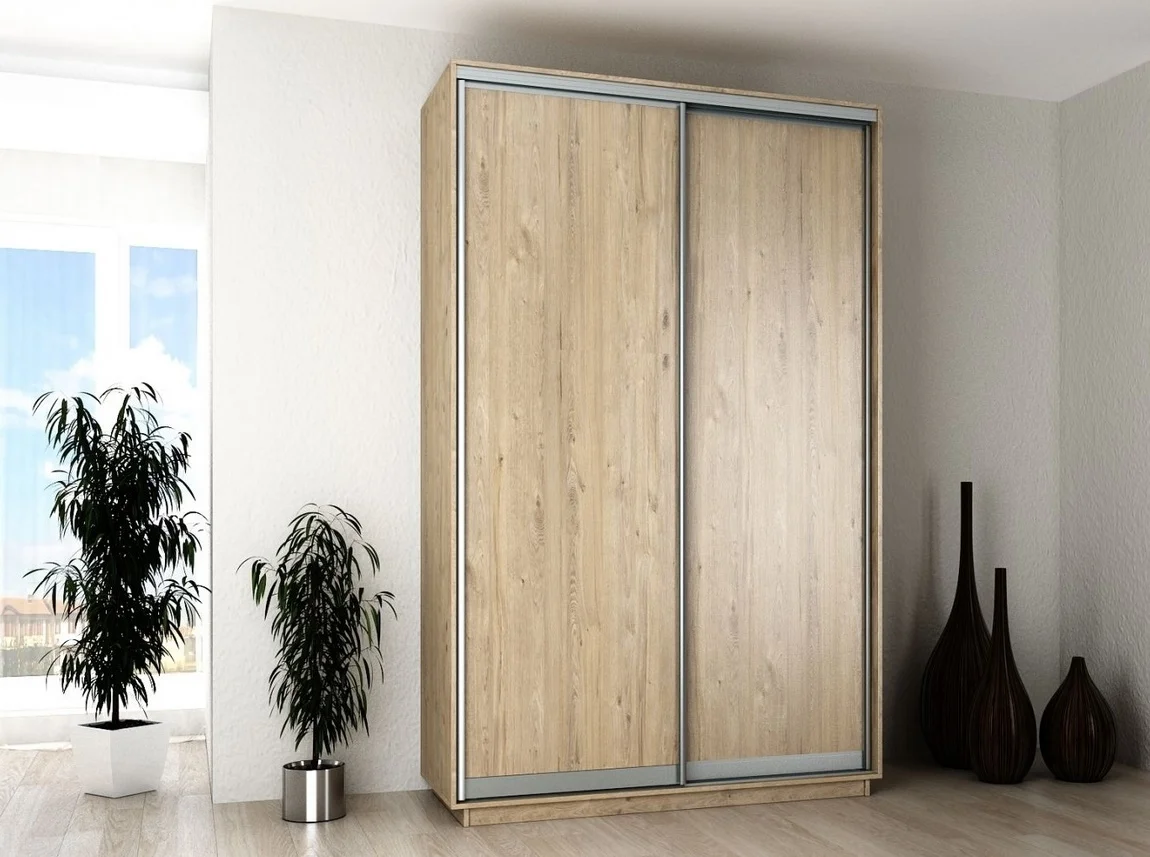Prostorově úsporná šatní skříň s posuvnými dveřmi v dekoru dub satin má rozměry 140 × 220 × 60 cm. Je vyrobena z LTD materiálu a doplňují ji aluminiové kování a lišty, které zajistí hladký a tichý chod dveří.