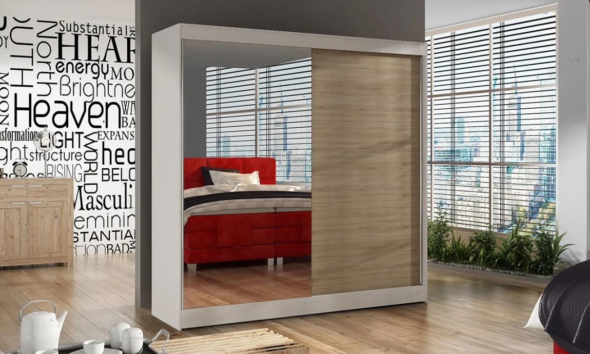 Šatní skříň se zrcadlem HEMIS I v kombinaci bílé barvy a dekoru dub sonoma nabízí stylové a praktické úložné řešení pro každou ložnici. Rozměry 200 x 58 x 215 cm poskytují dostatek prostoru pro odložení oblečení a doplňků.